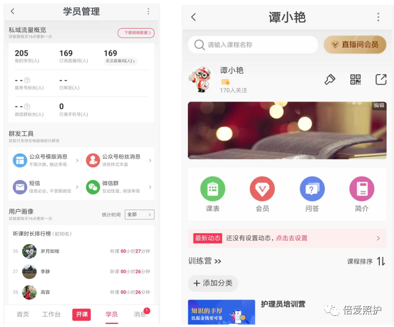 倍愛照護運用千聊、問卷星之類的培訓軟件,在制定好培訓計劃后,根據時間表進行培訓內容的實施。護理部通過電腦端/手機端發起PPT、語音、視頻等多種直播培訓,員工通過培訓邀請即可參加,不需要另外注冊賬號。提前邀請護理員自學培訓的內容,到點利用鏈接進行考試,督導及相關負責人變身為助教,既高效又直觀。